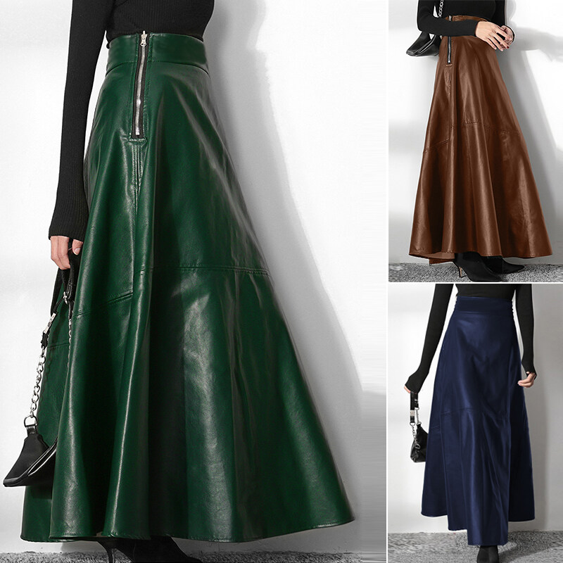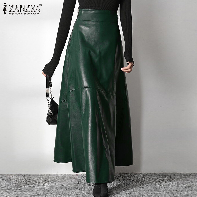 ZANZEA Women Plus Size Long Maxi Skirts High Waist Party Flare Swing PU Leather Skirt