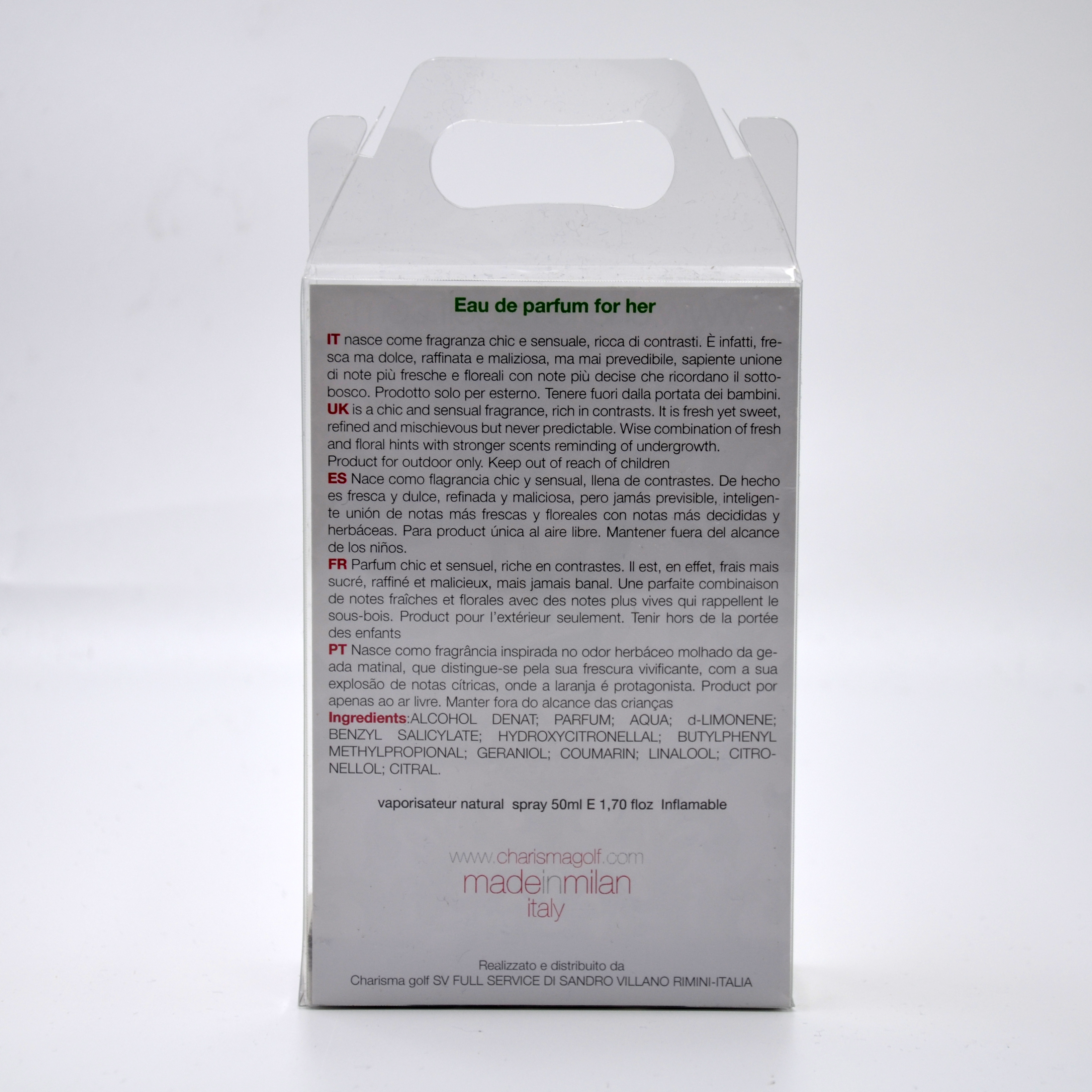 Feature Charismagolf for her, is a chic and sensual fragrance, rich in contrasts | It is fresh yet sweet, refined and mischievous but never predictable. Wise combination of fresh and floral hints with stronger scents reminding of undergrowth. At first, the fragrance is both fresh and sweet thanks to the blend of important Orange hints, floral Neroli and sweet Raspberry scents. The core includes sensual Orange, Gardenia and Jasmine flower fragrances. Lastly, these fresh floral notes are replaced by undergrowth nuances composed of patchouli, Cashmeran wood and sweet hints of honey and vanilla. | |||