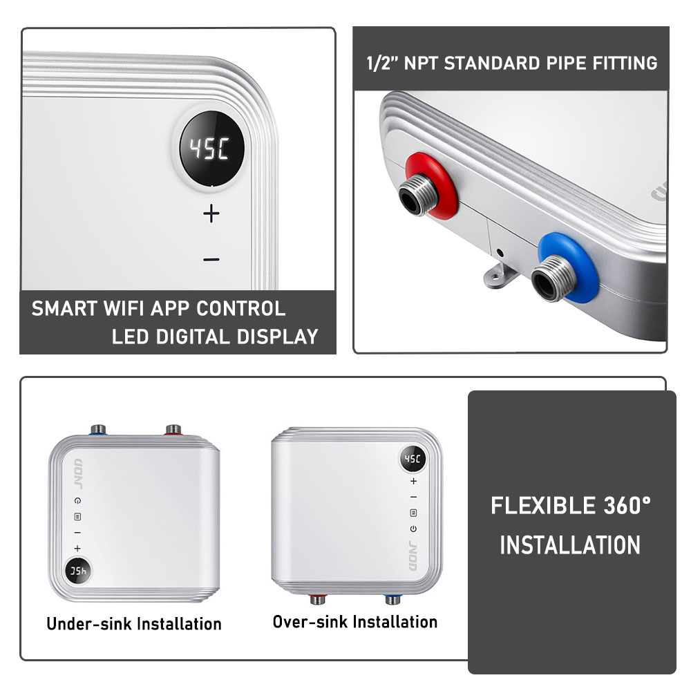 Feature | 1. High strength ABS splash proof casing 2. Compact size and unlimited supply of hot water 3. Easy Operation and installation 4. Automatic memory function 5. LED Display 6. Touch + wifi app control version 7. Fault auto detection 8. Upward or upside down installation 9. Micro-computer control, adopting patent heating technology. 10. Multiple safe protection | ||||||