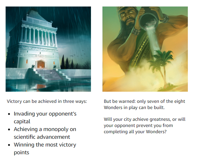 TAKE CONTROL OF YOUR CIVILIZATION: Decide to invest in science, military or prestige. If you fail to build defenses, your capital city may be destroyed, but ignore technology and your people may be left in the dark ages. Will your city achieve greatness, or will your opponent prevent you from completing all your Wonders?