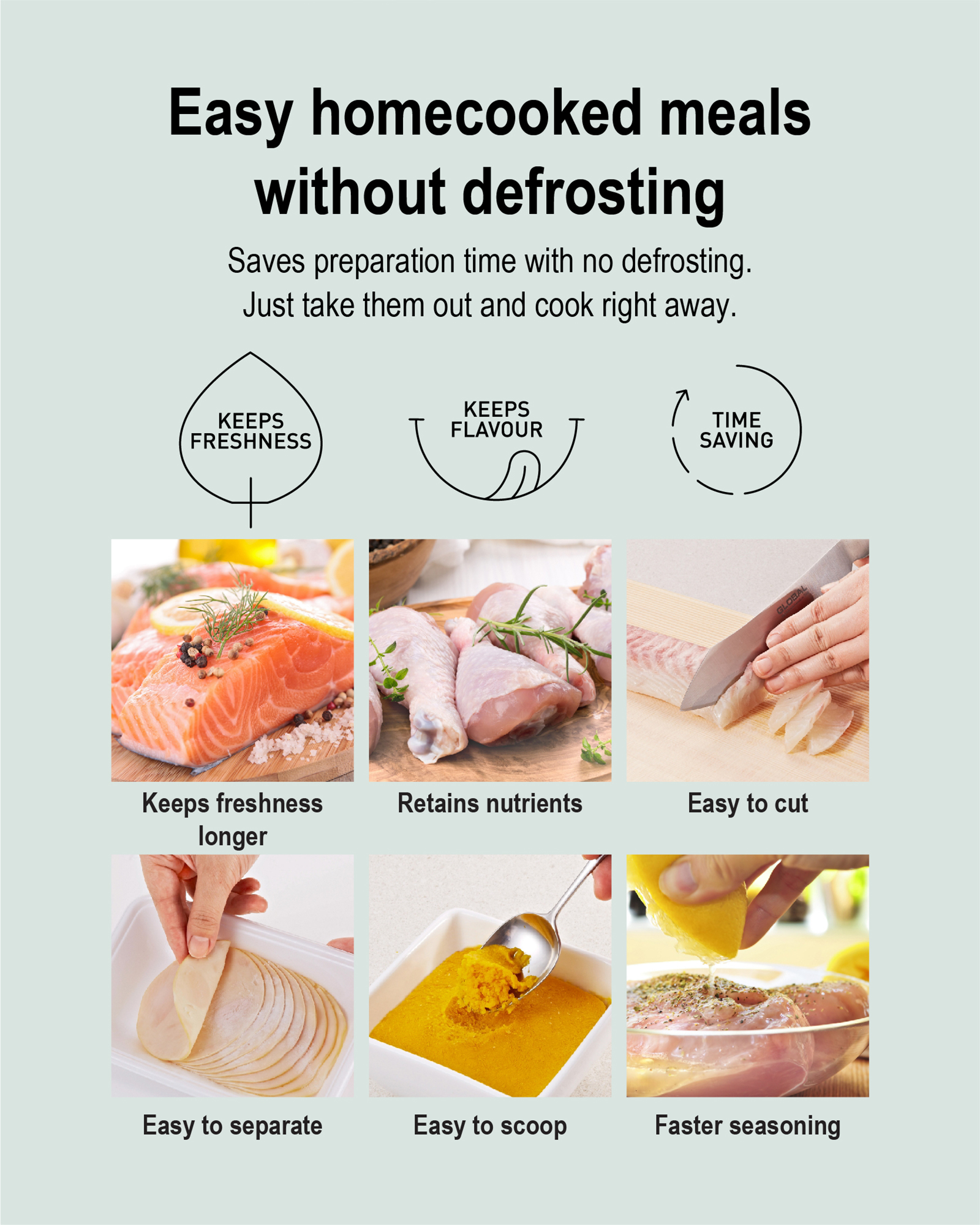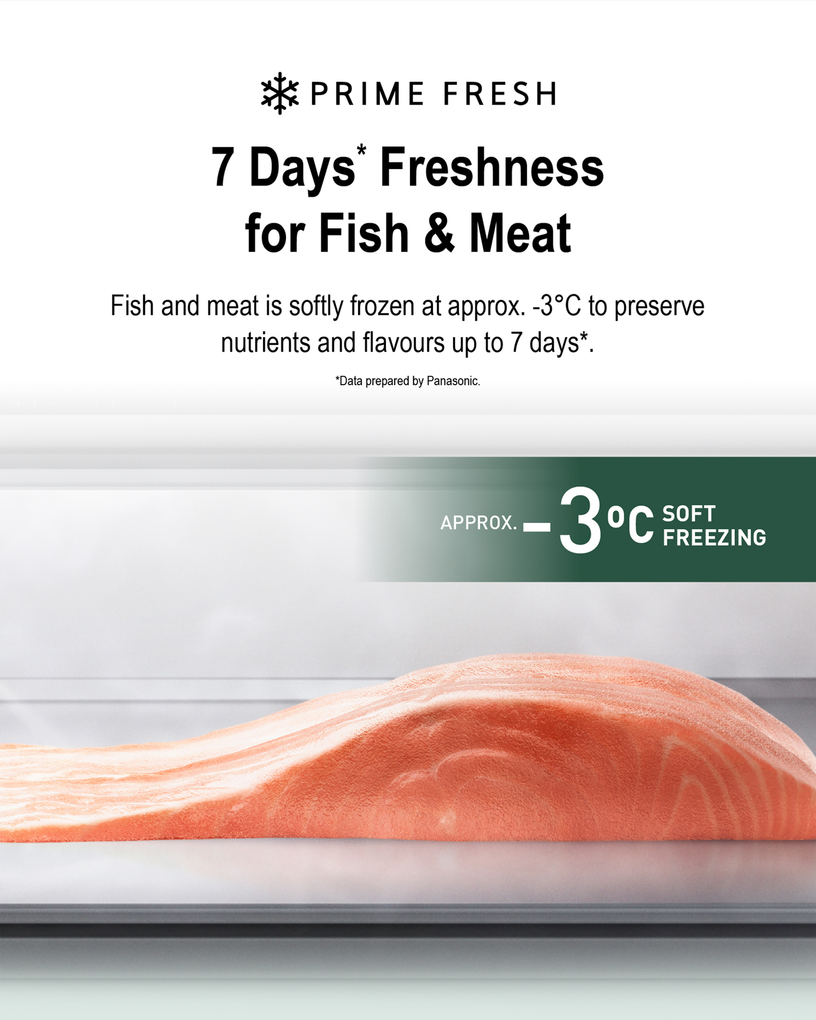 Prime Fresh keeps fish and meat softly frozen at approx. -3°C to preserve nutrients and flavours. No thawing is required so you can conveniently enjoy healthy meals up to 7 days*.