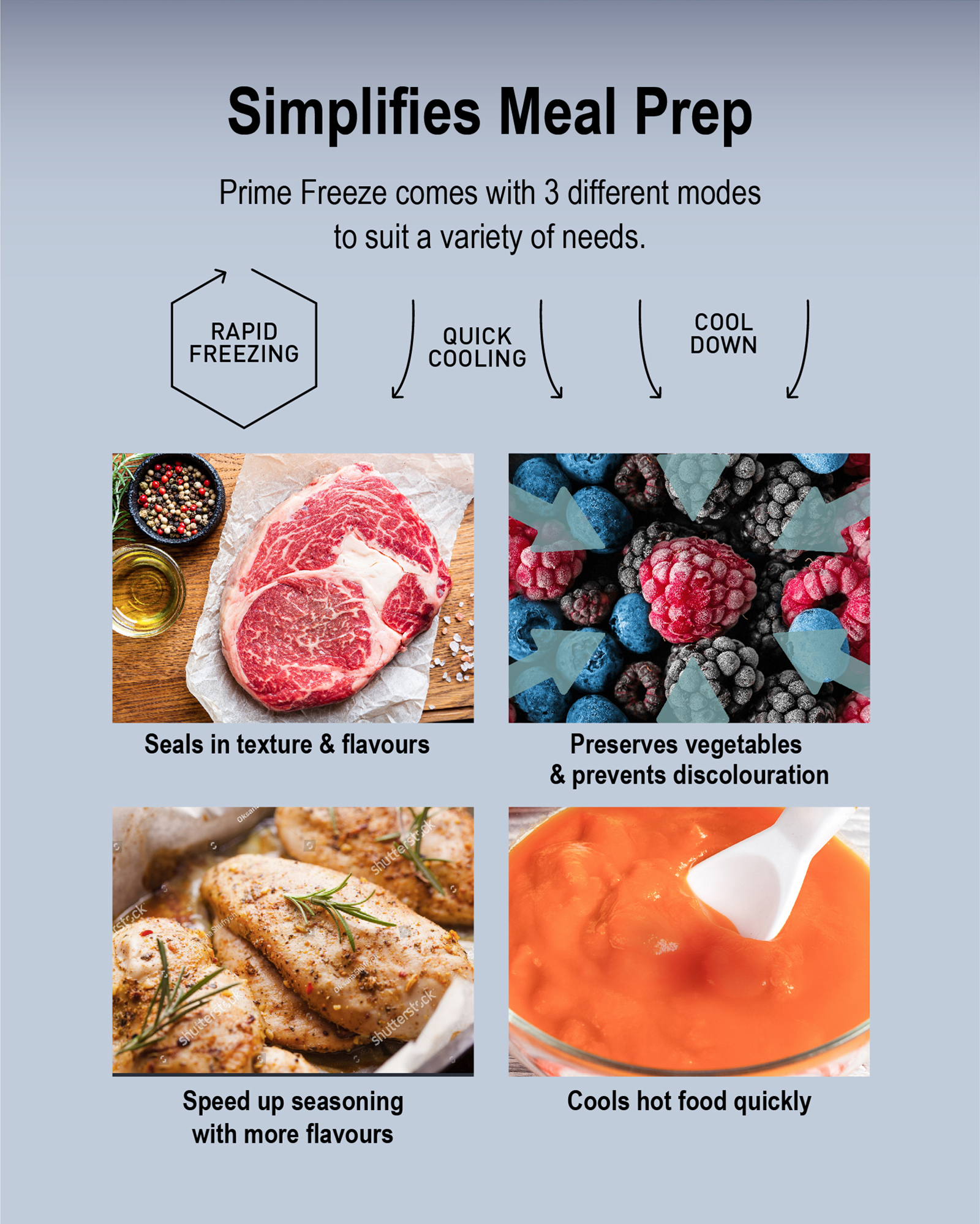 The Prime Freeze modes provide you with multiple methods to prepare meals, enriching your lifestyle with endless ways to make healthy meal preparation easier.