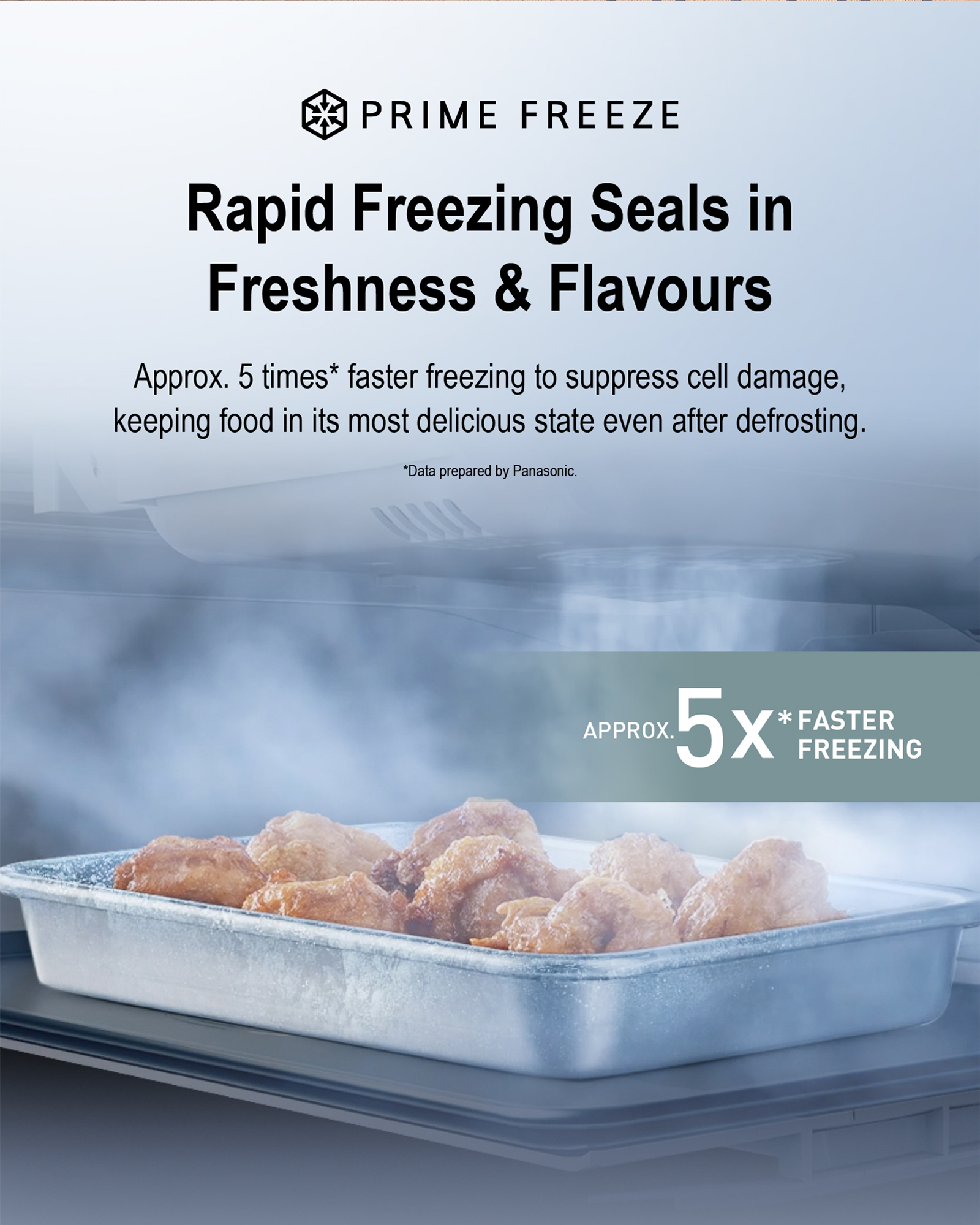 The speed at which ingredients are frozen changes how they taste. Prime Freeze freezes food at approx. 5 times* faster to suppress the damage of cells. This helps to minimise dripping after defrosting, keeping food at its most delicious state.