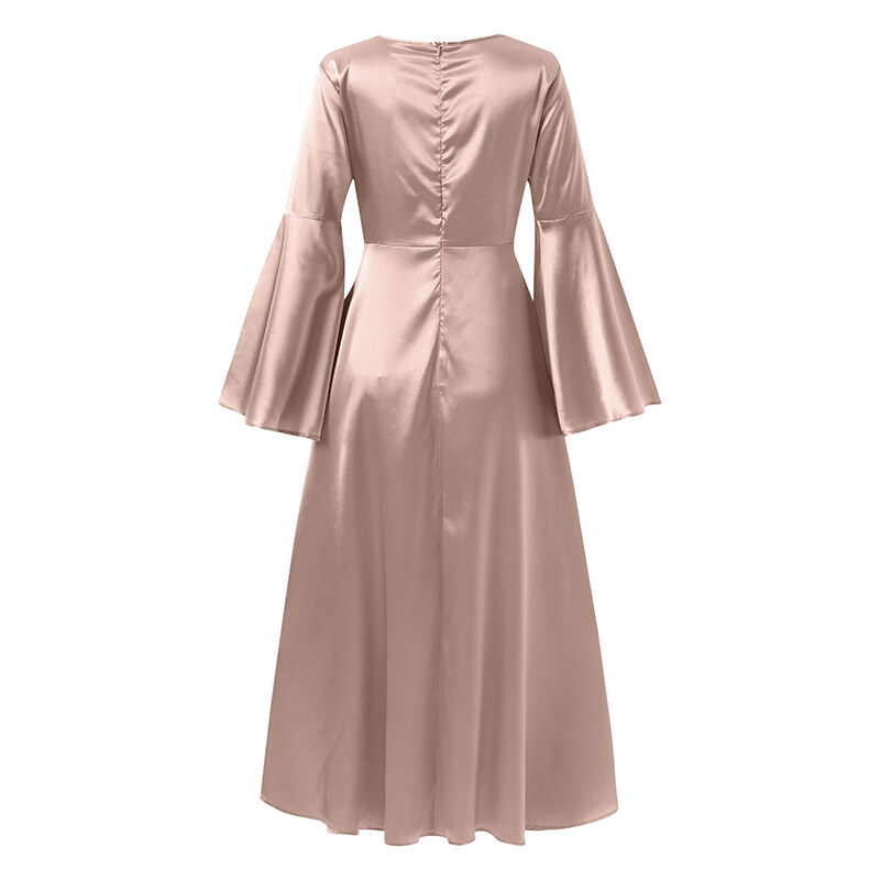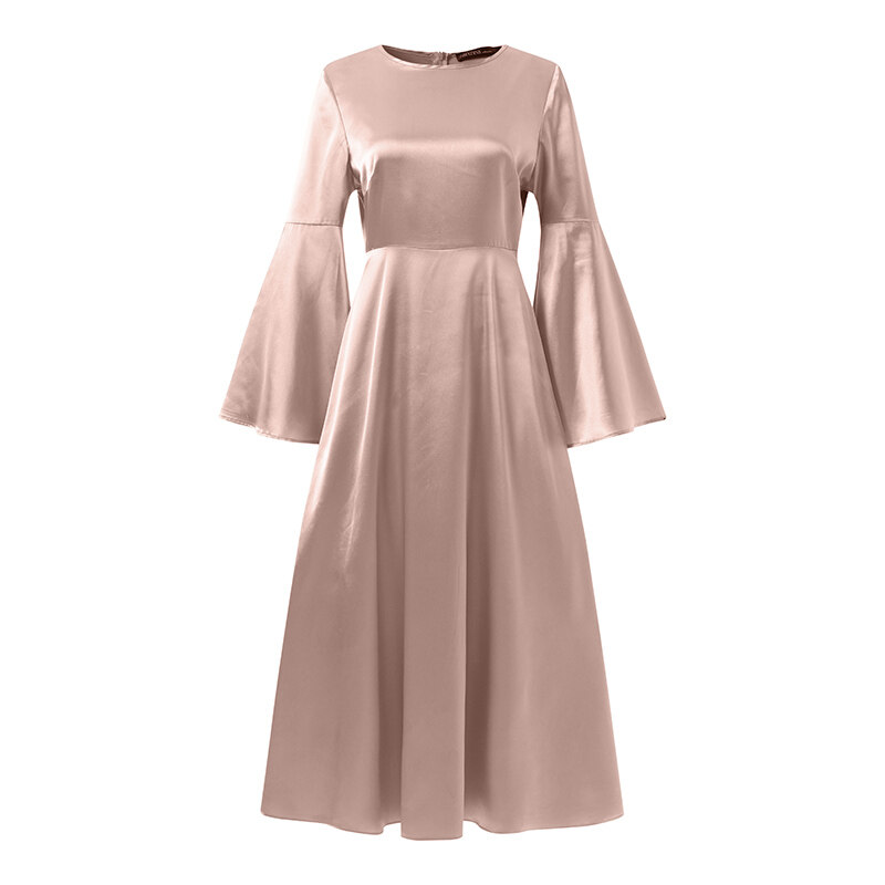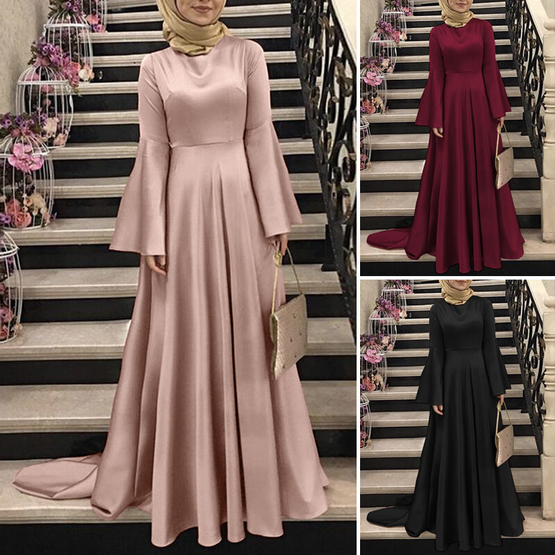 ZANZEA Muslimah Womens Muslim Flare Long Sleeve Satin Plain Party Gown Maxi Dresses