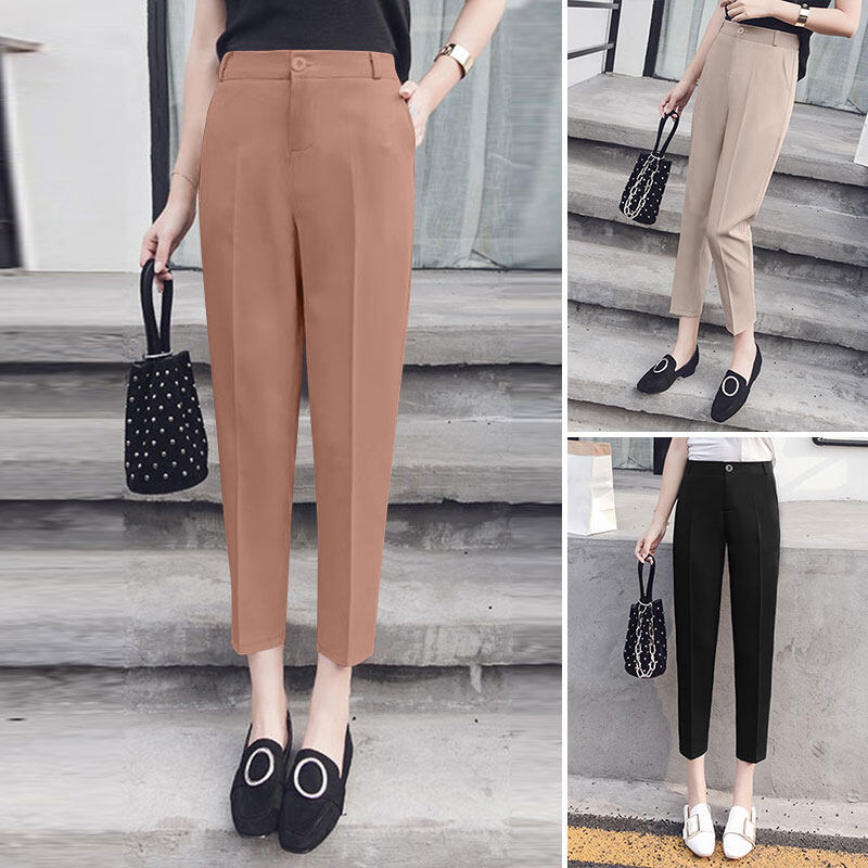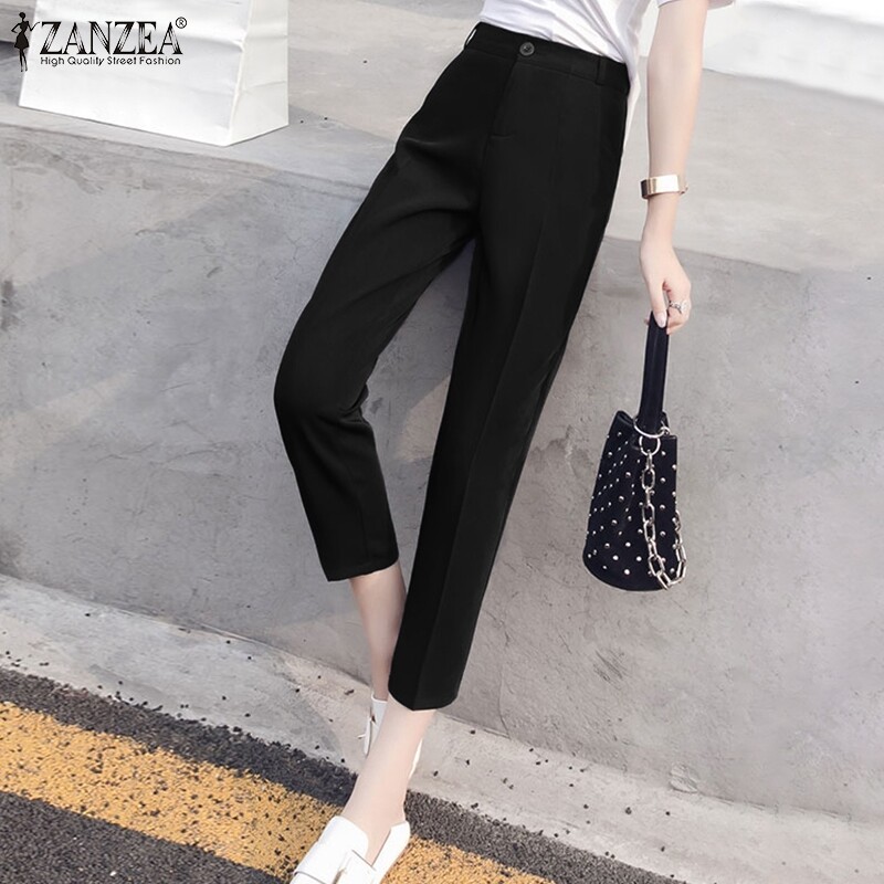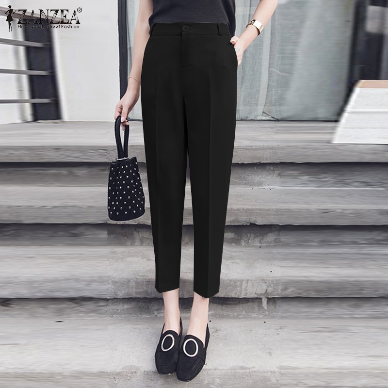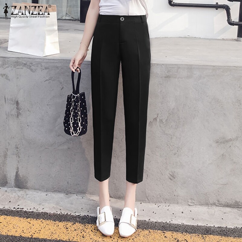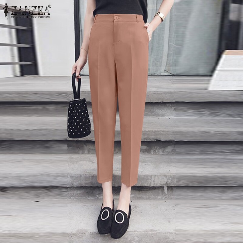 ZANZEA Womens Elastic Waist Plain Trousers Fit Work Office Long Suit Pants Bottoms