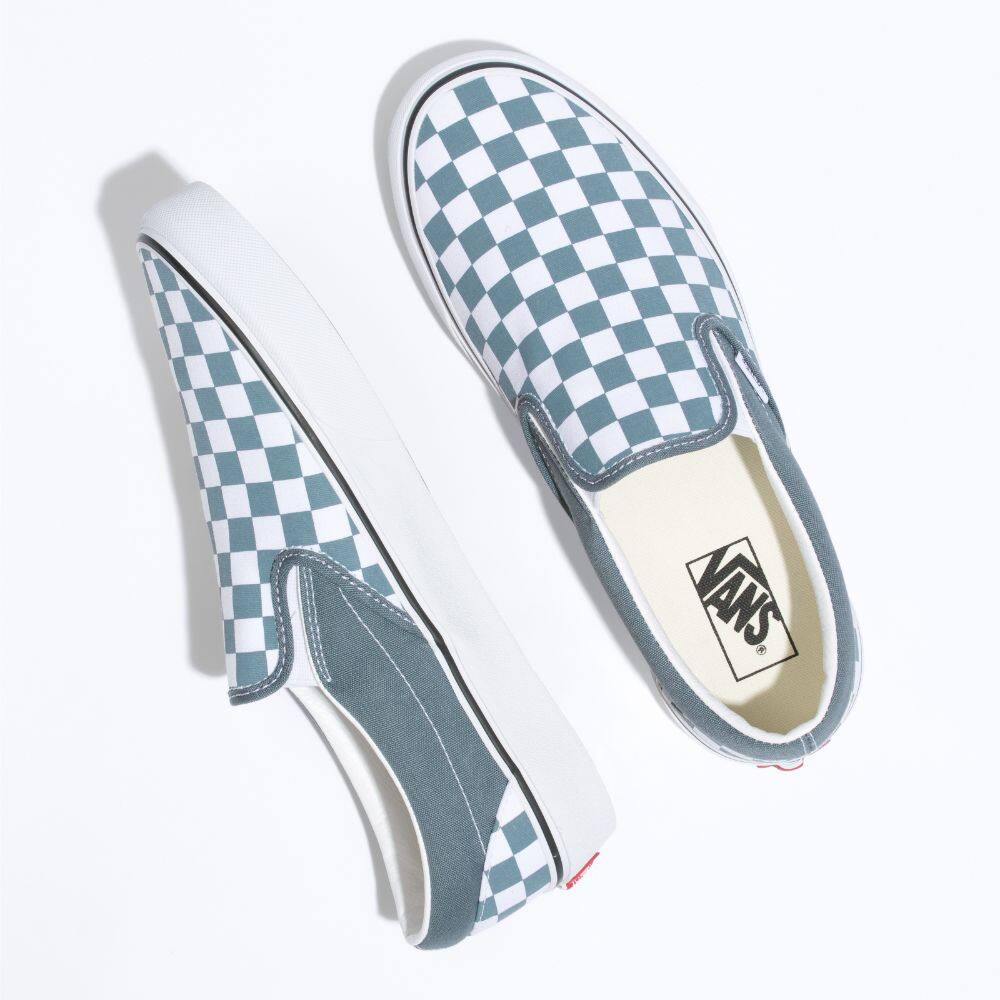 The Color Theory Classic Slip-On features sturdy low profile slip-on canvas uppers with the iconic Vans checkerboard print, padded collars, elastic side accents, and signature rubber waffle outsoles.