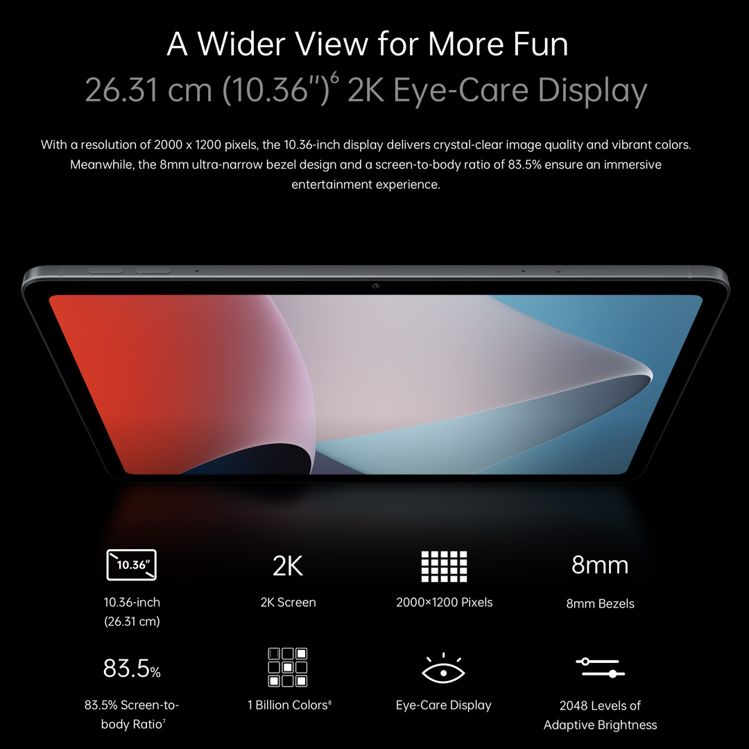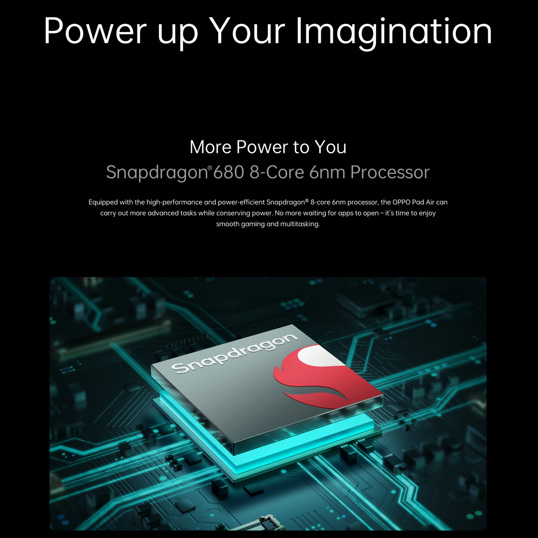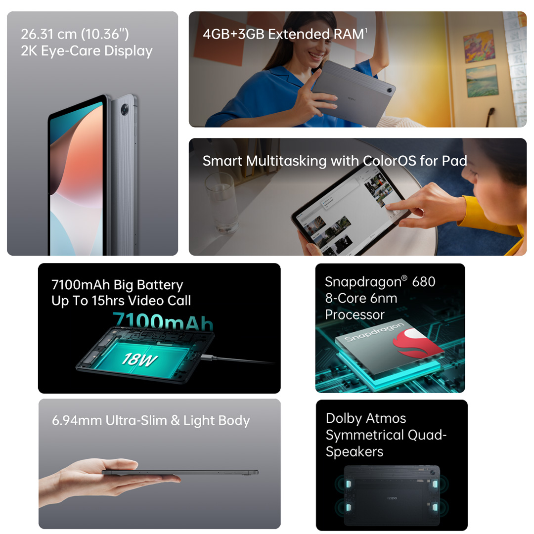 Snapdragon® 680 8-Core 6nm Processor 4GB + 3GB Extended RAM 26.31cm (10.36’’) 2K Eye-care Display 6.94mm Ultra-Slim & Light Body 7100mAh Big Battery Smart Multitasking with ColorOS for Pad
