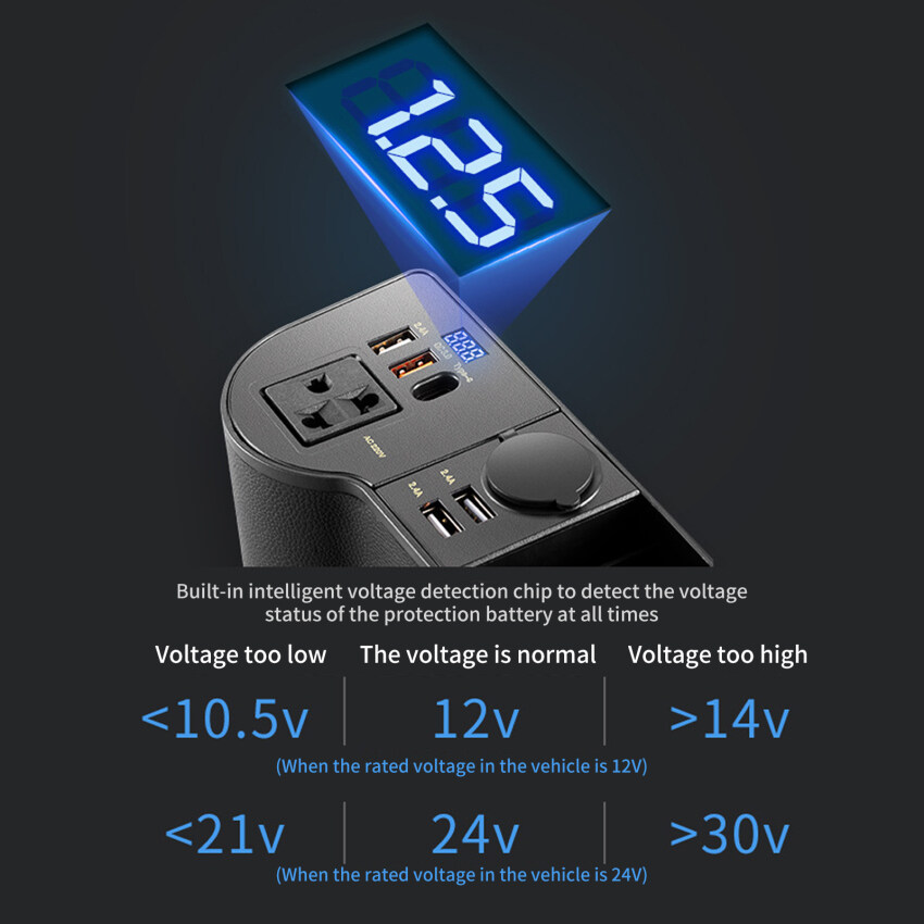 2. Suitable for 12V/24V cars, with multiple types of charging ports, including 3*2.4A USB ports, 1*QC3.0 fast charging USB port, 1*Type-C port, and 1*220V plug (compatible with European regulations, US Regulations and Australian regulations), 1*cigarette lighter interface.