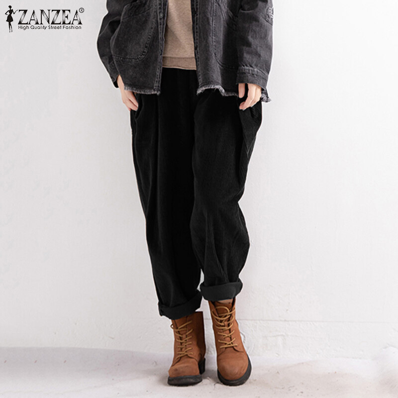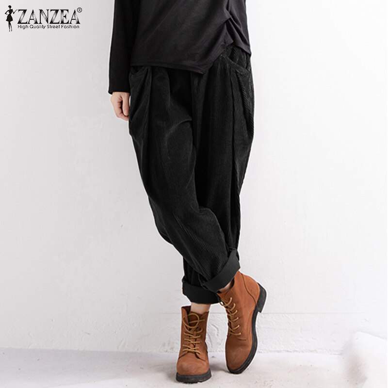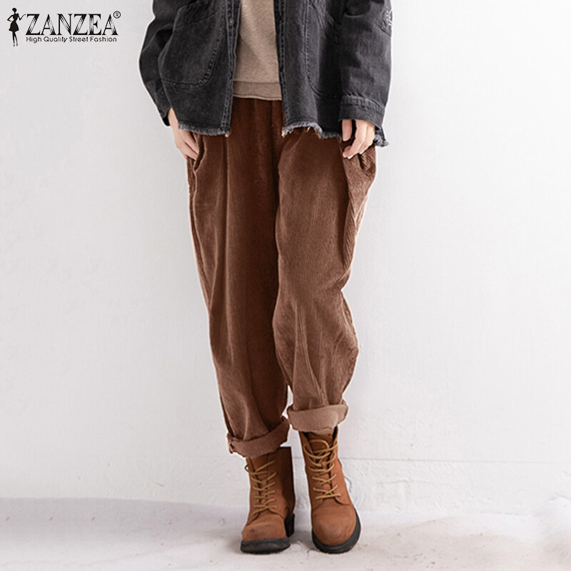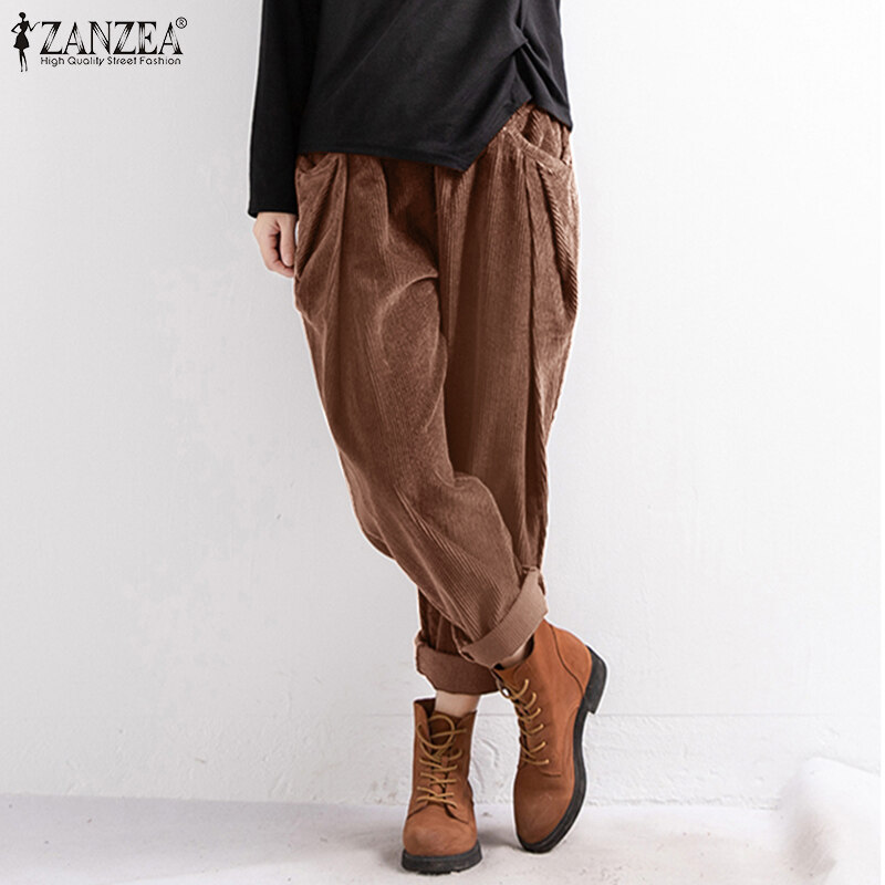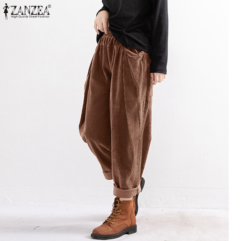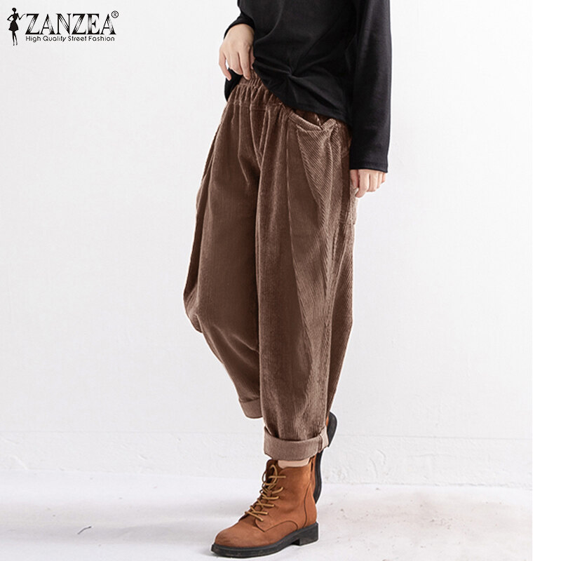 ZANZEA Women Elastic Waist Corduroy Wide Leg Pants Casual Loose Baggy Harem Trousers #8