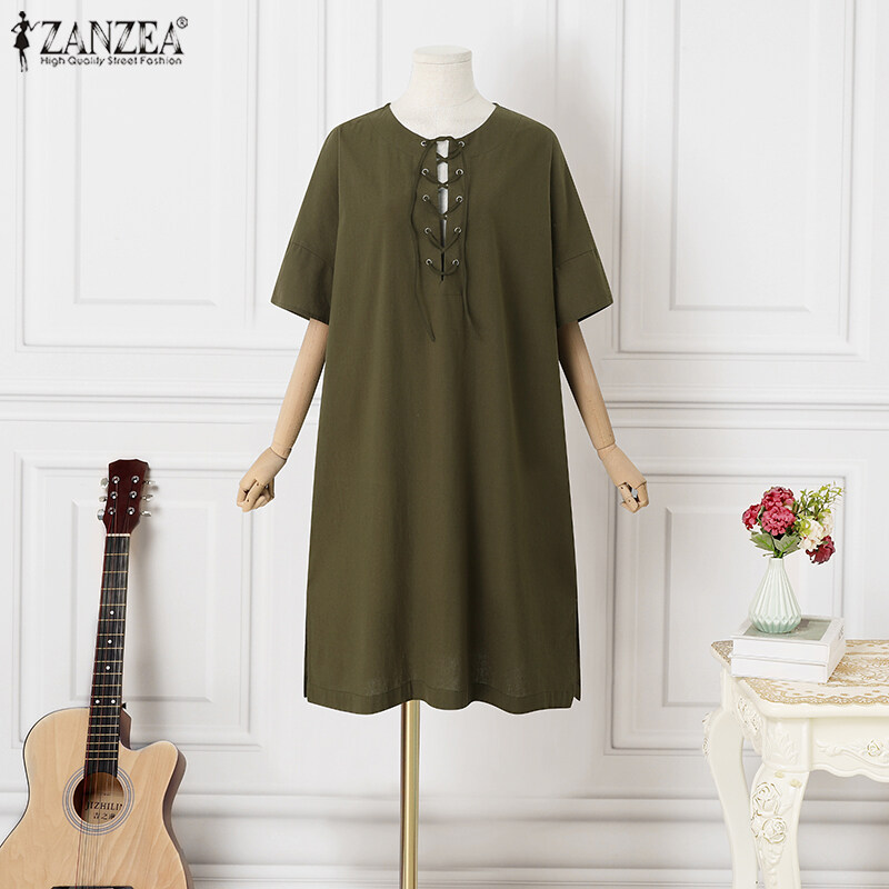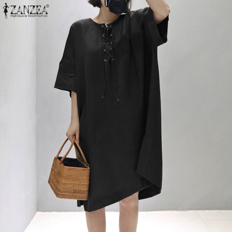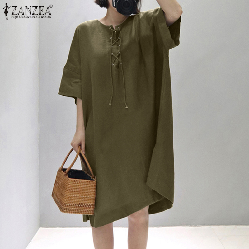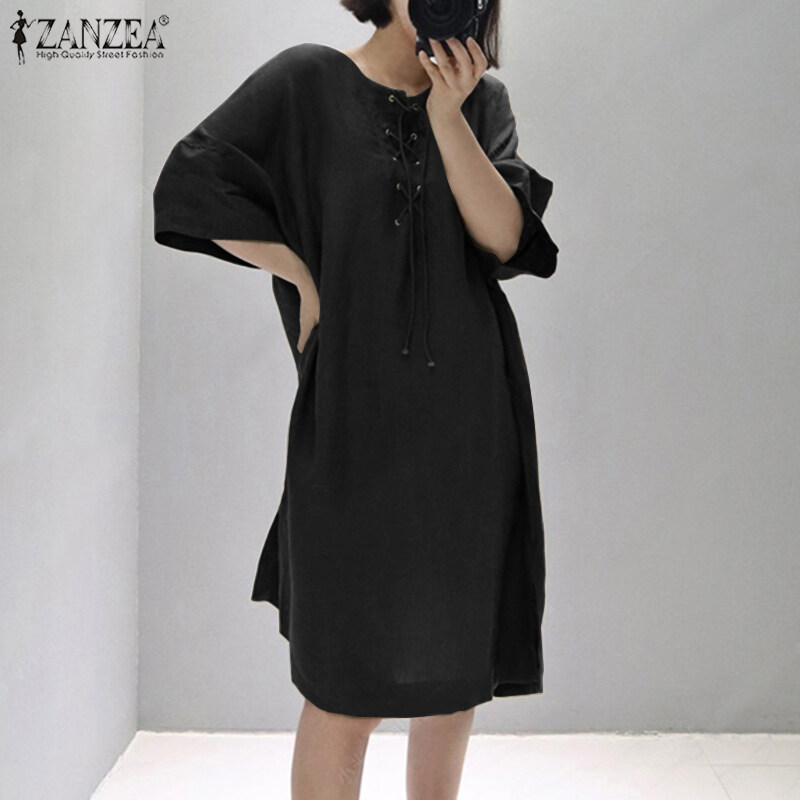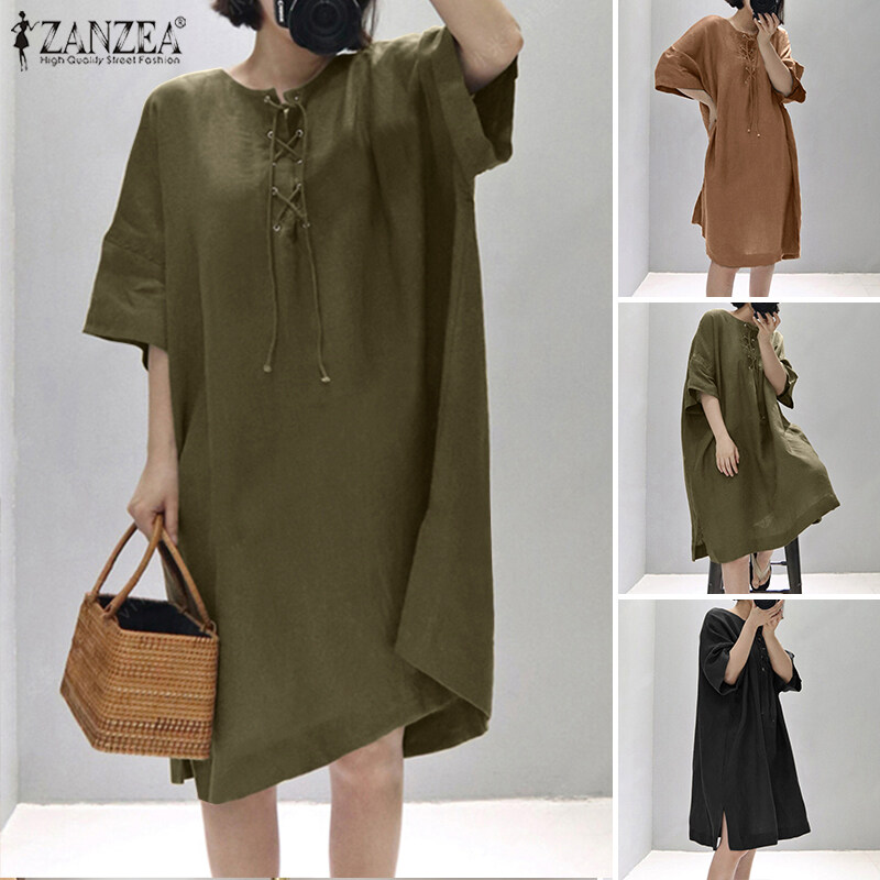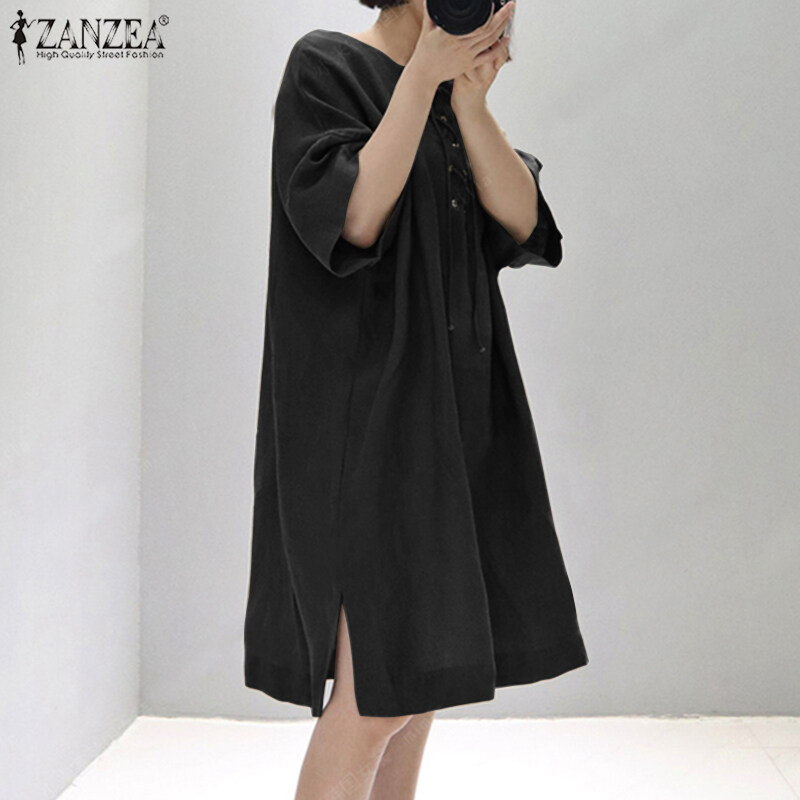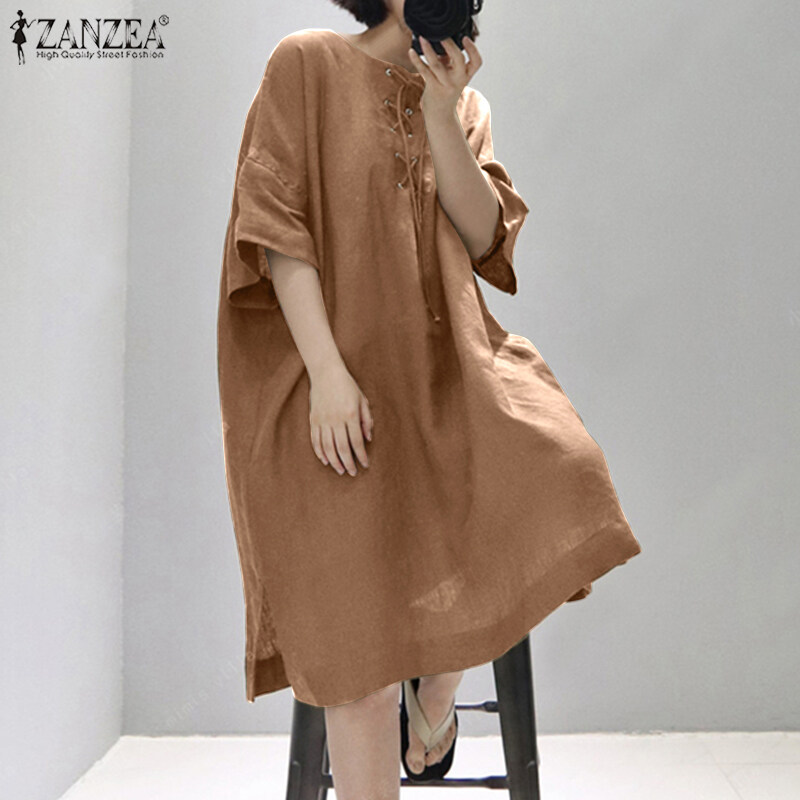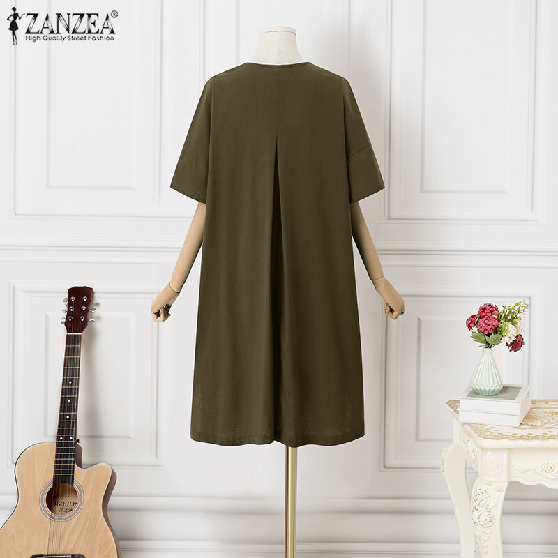 ZANZEA Women Vintage Leisure Solid Cotton Sundress Loose O-Neck Midi Dresses #8