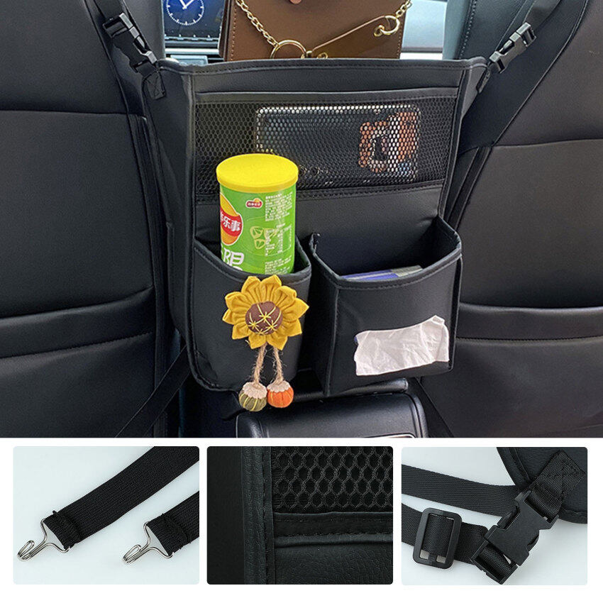 【Strong and Durable】Adopted high-quality leather, strong and sturdy. There are 2 touch fastener at the bottom to fix the storage bag, two adjustable ropes and on the top. Can be adjusted to a suitable size according to the distances between the two front seats.