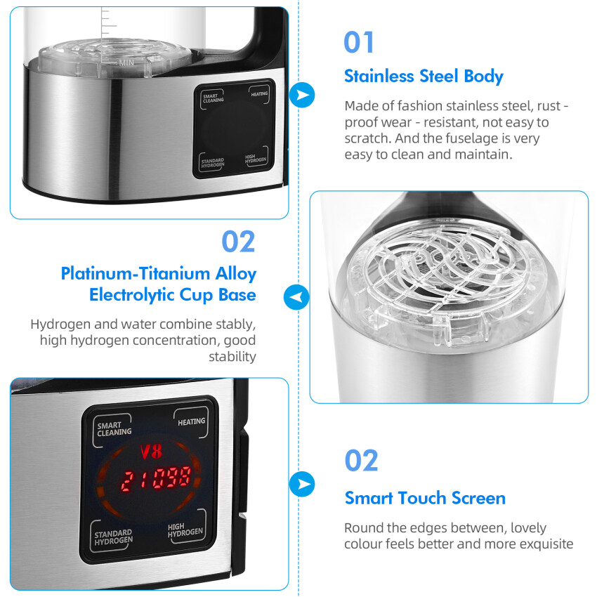 Wide application: the hydrogen water generator is a good choice for a healthy life. Drinking hydrogen rich water can stimulate metabolism and increase physical fitness. Improves blood circulation in the body, activates body cells, improves immunity, promotes digestion and improves sleep quality.
