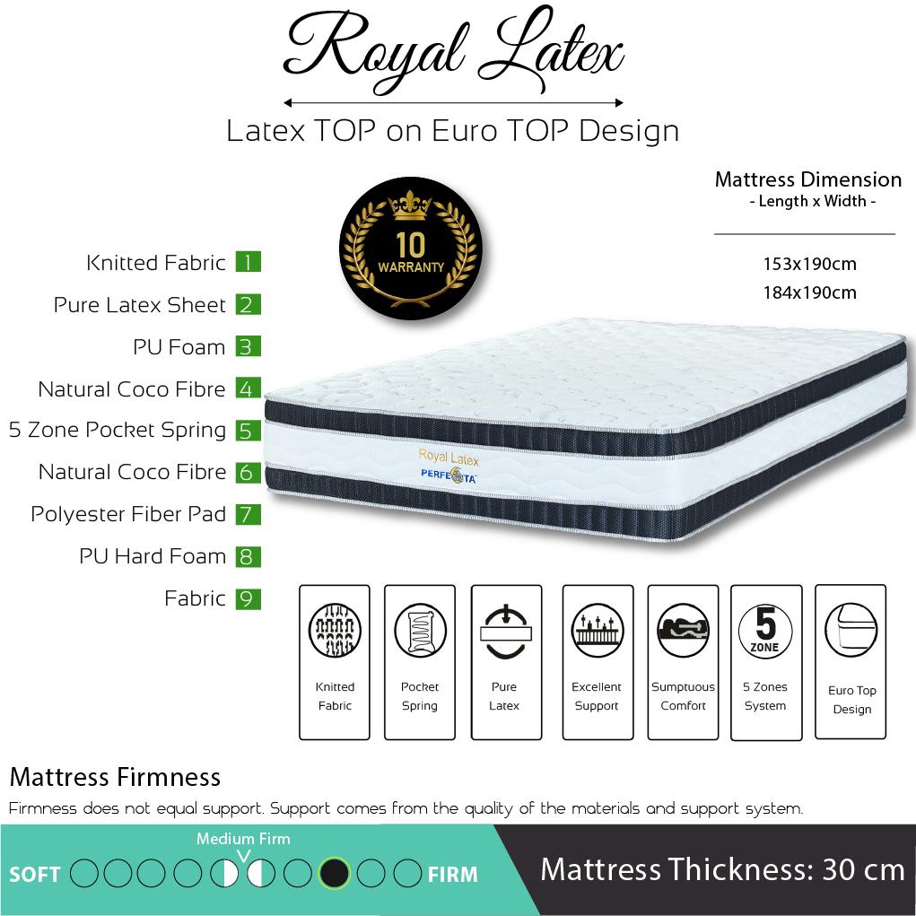 [Bulky] King Size - Perfecta Royal Latex 5 Zone Pocket Spring with Natural Latex Top on Euro TOP Design 12 Inch Mattress
