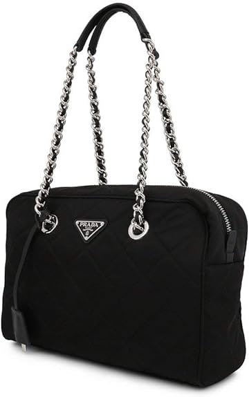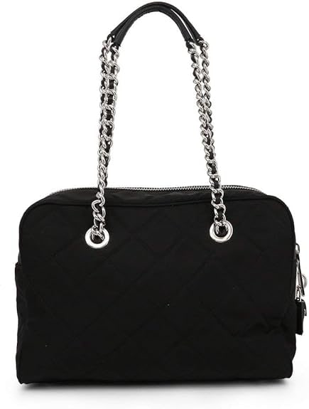 • Top zip closure, or use optional padlock to keep your items safe. It also features twelve-inch drop handles that comfortably sit n your shoulder. Color: black Material: quilted tessuto nylon Silver-tone hardware Double chain/leather handles Handle drop: 12" inches 4 protective metal feet Top zip closure Removable clochette and lock Includes lock and keys