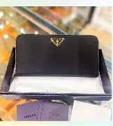 • This wallet from Prada is crafted with black Tessuto nylon and features the signature triangle Prada logo. The three-sided zipper closure opens to a saffiano leather-lined interior divided into two main compartments with bill slots and card slots.